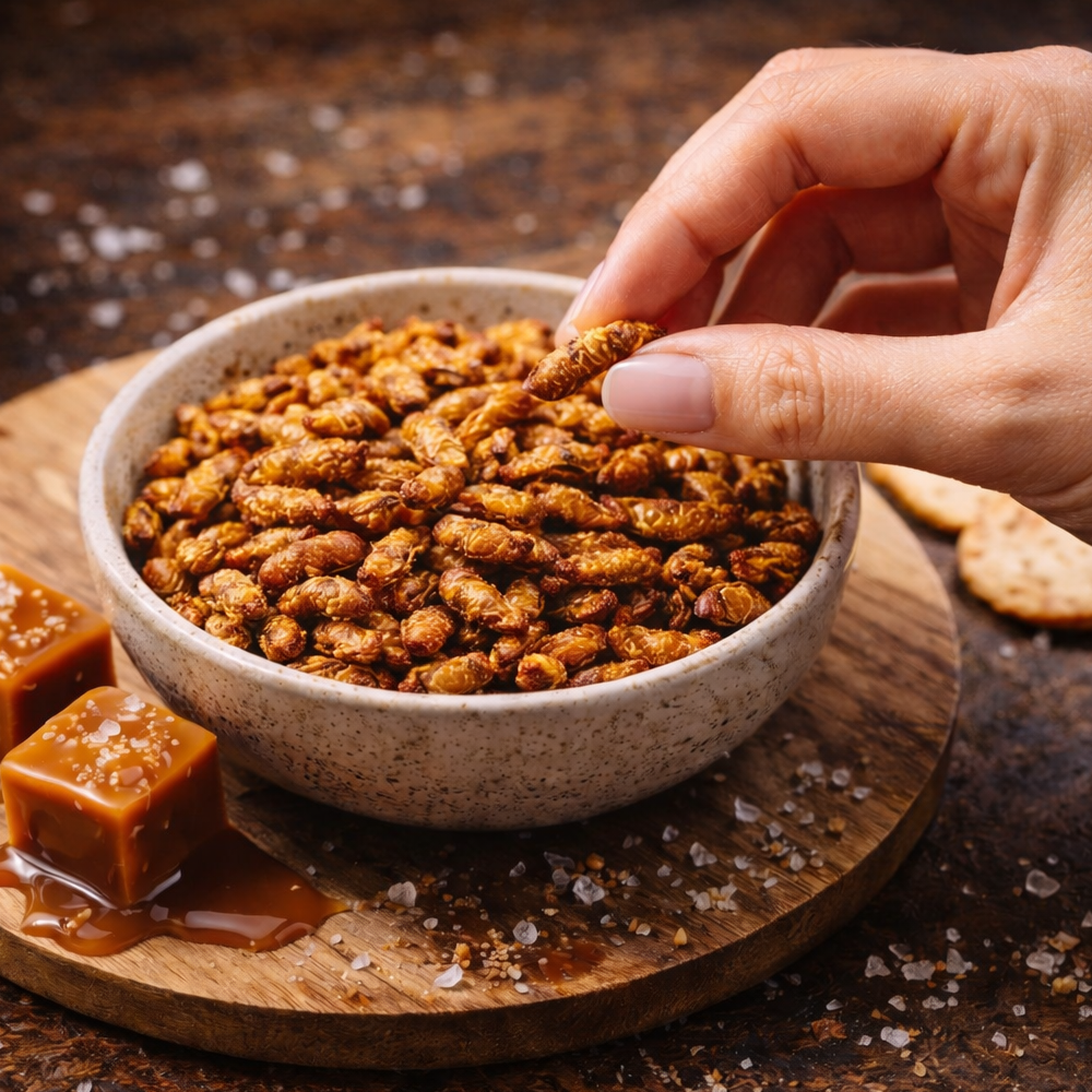 Sūria karamele dengti džiovinti svirpliai sukuria netikėtą ir labai modernų skonio derinį: švelniai saldus karamelės poskonis susilieja su subtilia druska ir natūraliu riešutiniu svirplių traškumu. Tai išskirtinis gurmaniškas užkandis, kurį pirmą kartą pristatėme degustacijose – ir jis akimirksniu tapo favoritu.